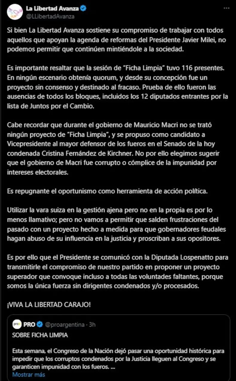 Desde el PRO, la respuesta fue contundente. A través de un comunicado, expresaron que el Congreso había dejado pasar una "oportunidad histórica" para evitar que los corruptos llegaran al Congreso y se aseguraran impunidad con los fueros. El PRO subrayó que sus diputados cumplieron con el mandato popular y reiteraron que "Ficha Limpia" es un tema clave para el país. Aseguraron estar comprometidos con erradicar la corrupción y recordaron que, mientras ellos luchan por esta ley, el Gobierno se posicionó del lado de los "corruptos".