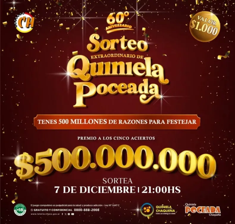 Este sábado, como es habitual se sorteará la quiniela Poceada Chaqueña, pero con un valor especial, se trata de una edición extraordinaria cuyo premio mayor será de 500 millones de pesos.