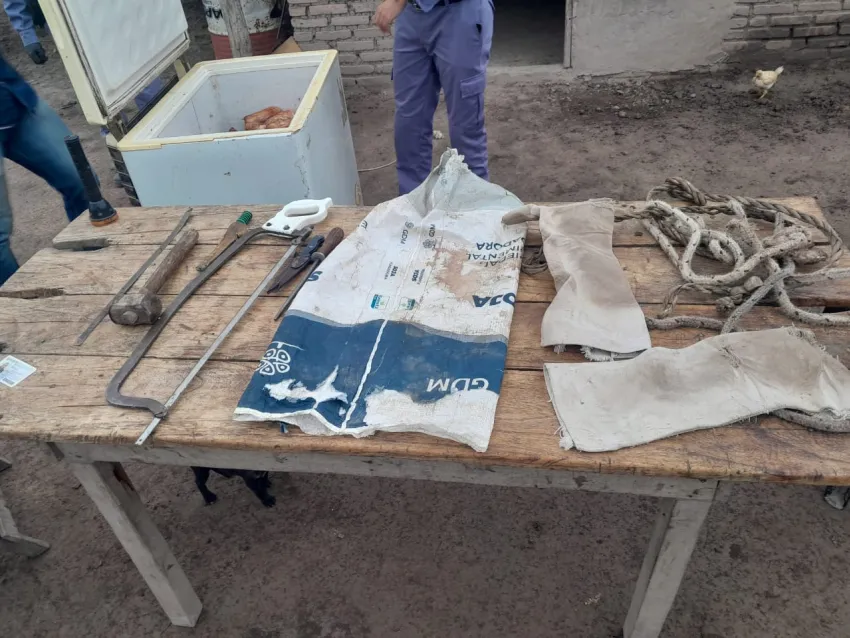 En el operativo librado, se incautó en total 100 kilos de carne bovina, un freezer, una mesa y herramientas con manchas de sangre, entre las que se incluían cuchillos, una chaira, una sierra manual y un martillo tipo maza.