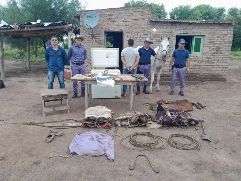 A partir de un hecho ocurrido hace semanas atrás, la Policía libró una investigación debido a una causa de abigeato en el interior provincial. Por este motivo, este sábado, la fuerza realizó un allanamiento en una vivienda del paraje El Quemado, en donde encontraron carne, cueros, herramientas utilizadas para la faena de animales y hasta armas de fuego. Además, detuvieron a uno de los principales sospechosos del delito.