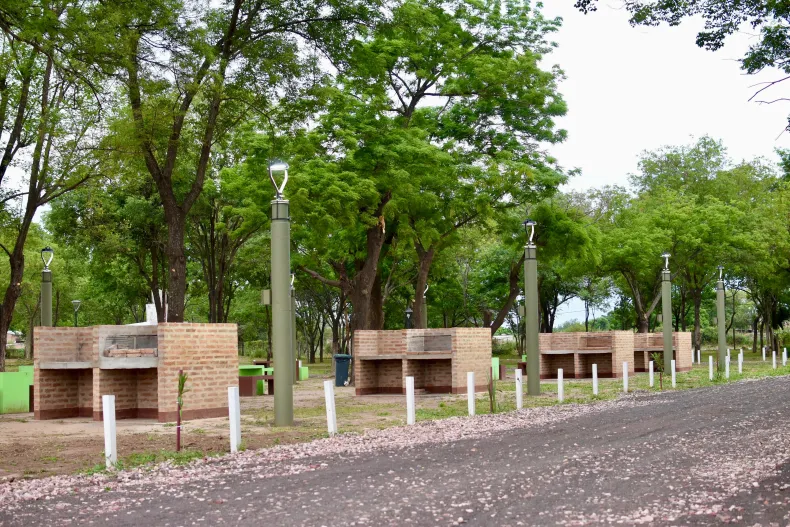 Además, se construyeron columnas de hormigón visto pintadas con látex y se instaló un cartel identificatorio. Por su parte, la Municipalidad realizó la refacción y pintura de los baños, la instalación de juegos para niños, enripiado de las calles e iluminación en los alrededores del camping.
