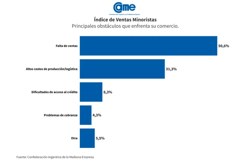 Al momento de mencionar los obstáculos que enfrenta la pyme, en noviembre el 50,6% apuntó a la falta de ventas; 31,3% ubicó a los altos costos de producción y logísticos; el 8,3% se refirió a los obstáculos para acceder al crédito, y 4,3% a los problemas de cobranzas, que en algunos rubros como Alimentos y bebidas fue más importante que en otros. Los resultados se mantuvieron en niveles similares a los del mes anterior.