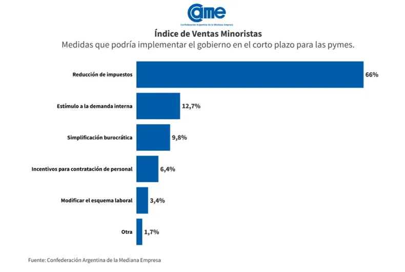 Más allá de las cuestiones impositivas, sobresalió el reclamo de medidas que fortalezcan la demanda interna con 12,7% de las respuestas (vs. 11,4% el mes previo), la simplificación burocrática con 9,8%, y la generación de incentivos para la contratación de personal (6,4%).