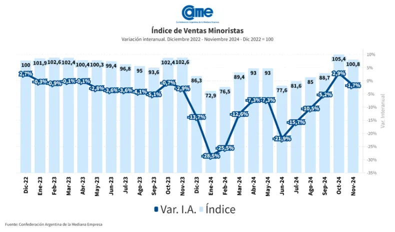 Las ventas minoristas pyme cayeron 1,7% interanual en noviembre