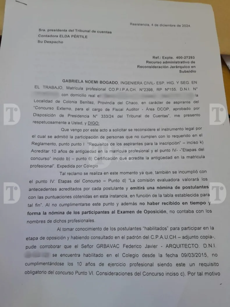 Una de las concursantes, la ingeniera civil, Gabriela Noemí Bogado, presentó un recurso administrativo argumentando que Gravac no cumple con el requisito de 10 años de antigüedad en su matrícula profesional, ya que su habilitación es de marzo de 2015, por lo que no alcanzaría la antigüedad mínima exigida por el reglamento. Además, Bogado cuestionó la falta de transparencia en la comunicación del proceso, señalando que no recibió a tiempo la nómina de los participantes ni los criterios de evaluación, lo que afectó su capacidad para competir en condiciones de igualdad.
