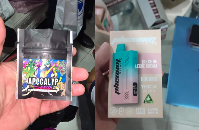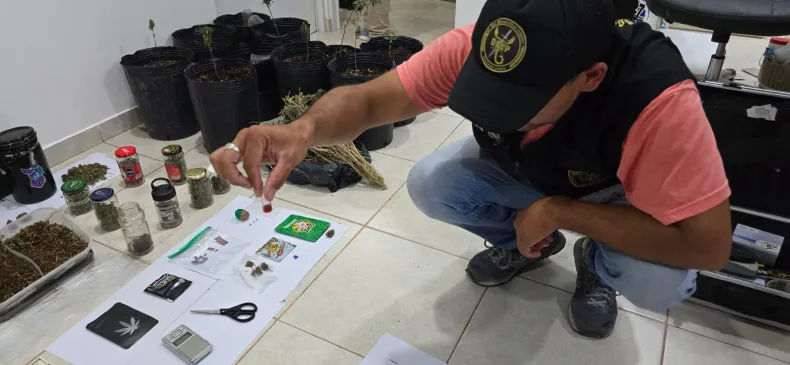También se encontraron 10 plantines de cannabis en macetas, 2 troqueles de LSD, restos de pastillas con éxtasis y 35 envoltorios con pastillas sin inscripción. Entre los elementos secuestrados, se identificaron 12 dispositivos "Pod Phenom Miami" con THC, gomitas con THC, una balanza de precisión, tijeras con restos de cannabis, $ 922.000 en efectivo, US$ 700 y dos teléfonos celulares.