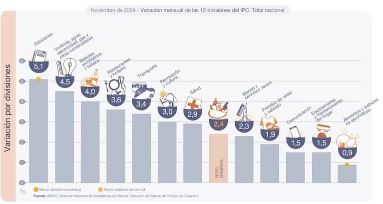 Los mayores aumentos en el mes estuvieron en Educación (5,1%), seguida de Vivienda, agua, electricidad, gas y otros combustibles (4,5%) por las subas en Alquiler de la vivienda y gastos conexos; Suministro de agua; y Electricidad, gas y otros combustibles.