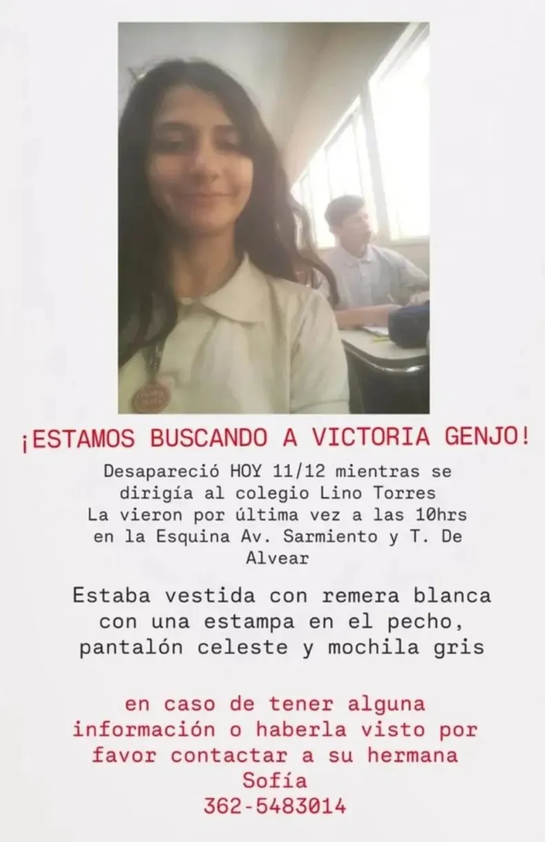 Victoria Abril Genjo, de 19 años, es intensamente buscada desde el pasado miércoles en Resistencia. La joven fue vista por última vez alrededor de las 10 de la mañana cuando se dirigía al colegio Lino Torres, donde debía rendir una materia. Su hermana de 23 años denunció su desaparición en la Comisaría Duodécima Metropolitana, detallando que Victoria tiene retraso madurativo.