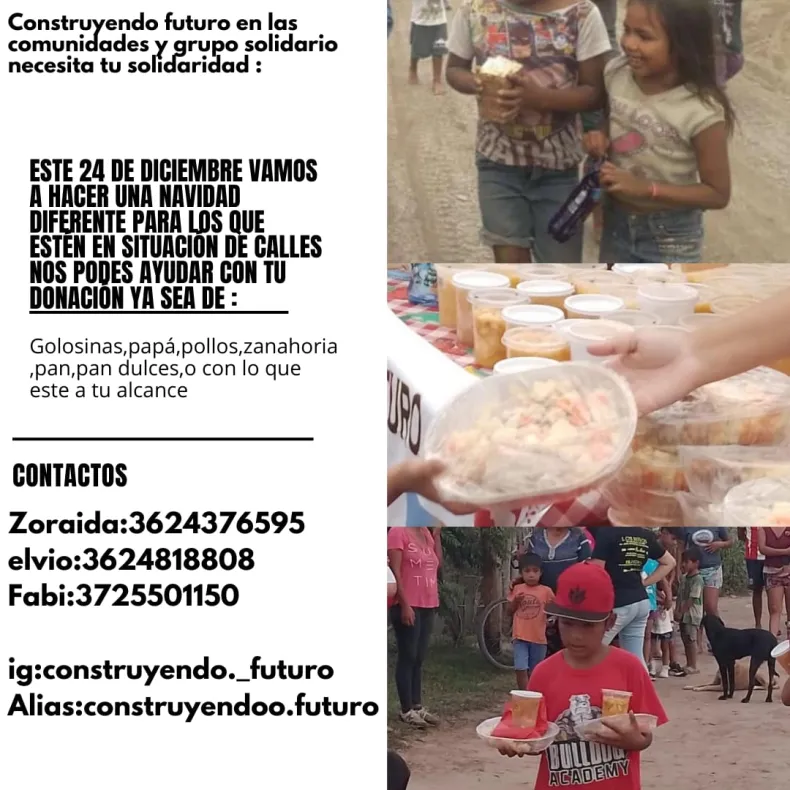 Este año, el grupo solidario "Construyendo Futuro" vuelve a convocar a la comunidad para sumar su granito de arena. Necesitan donaciones de alimentos como golosinas, papas, pollos, zanahorias, pan y pan dulce, entre otros productos que permitan armar las bandejas navideñas para las personas en situación de calle. "Queremos que todos puedan vivir una Navidad diferente, con una comida digna y un momento de felicidad", remarcaron.