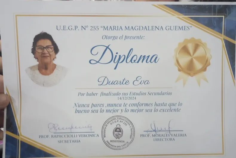 Otra de las egresadas es Eva Duarte de 79 años, quien dijo sentirse "muy lúcida", como para seguir estudiando, y que haber obtenido este título la hace sentir "muy feliz y realizada". La mujer contó que trabajó incluso después de jubilada, y finalmente cuando se le dio esta oportunidad, se anotó al colegio y agradeció a sus compañeros "que me apoyaron mucho".
