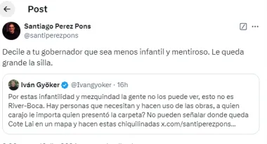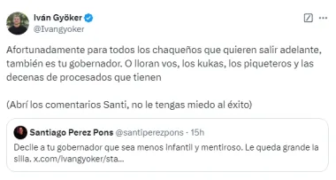El cruce finalizó con otra respuesta de Gyöker, "también es tu gobernador", sentenció y finalizó: "Lloran vos, los kukas, los piqueteros y las decenas de procesados que tienen".