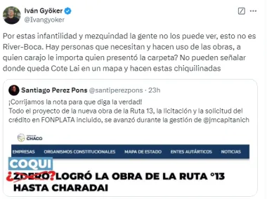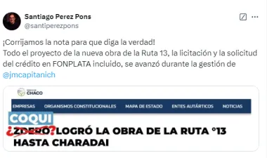 Este lunes, Leandro Zdero anuncio que con gestiones realizadas en la ciudad autónoma de Buenos Aires se logró el financiamiento para la pavimentación de la Ruta N°13 en el interior de la provincia. El diputado Santiago Perez Pons, funcionario de la gestión anterior cuestionó la información: "Todo el proyecto, la licitación y la solicitud del crédito en FONPLATA incluido, se avanzó durante la gestión de Jorge Capitanich", aseguró y no tardó en recibir respuestas del oficialismo.
