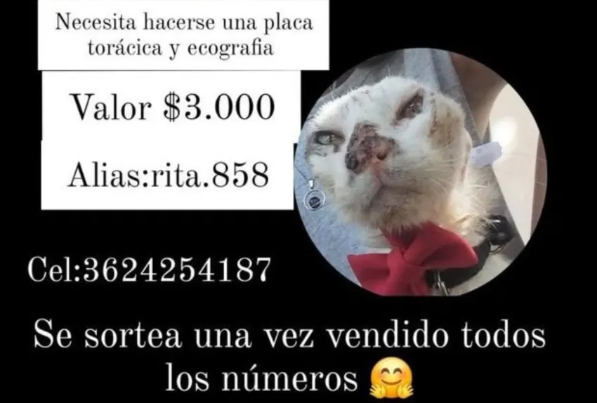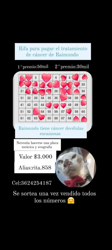 Raimundo es un gato que tiene un diagnóstico de cáncer y su dueña, Rita, hace una rifa para poder costear gastos médicos. Explicaron que necesita hacerse una placa torácica y una ecografía para su tratamiento de carcinoma de células escamosas.