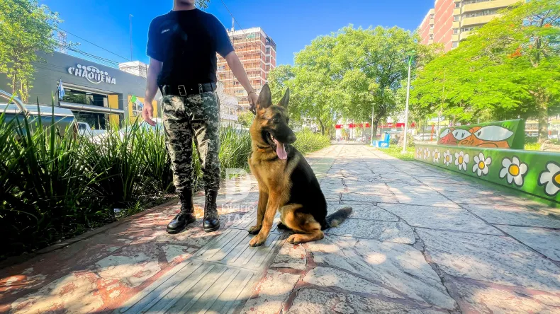 El perro policía recorre la plaza central de Resistencia junto a un agente, custodiando el espacio.
