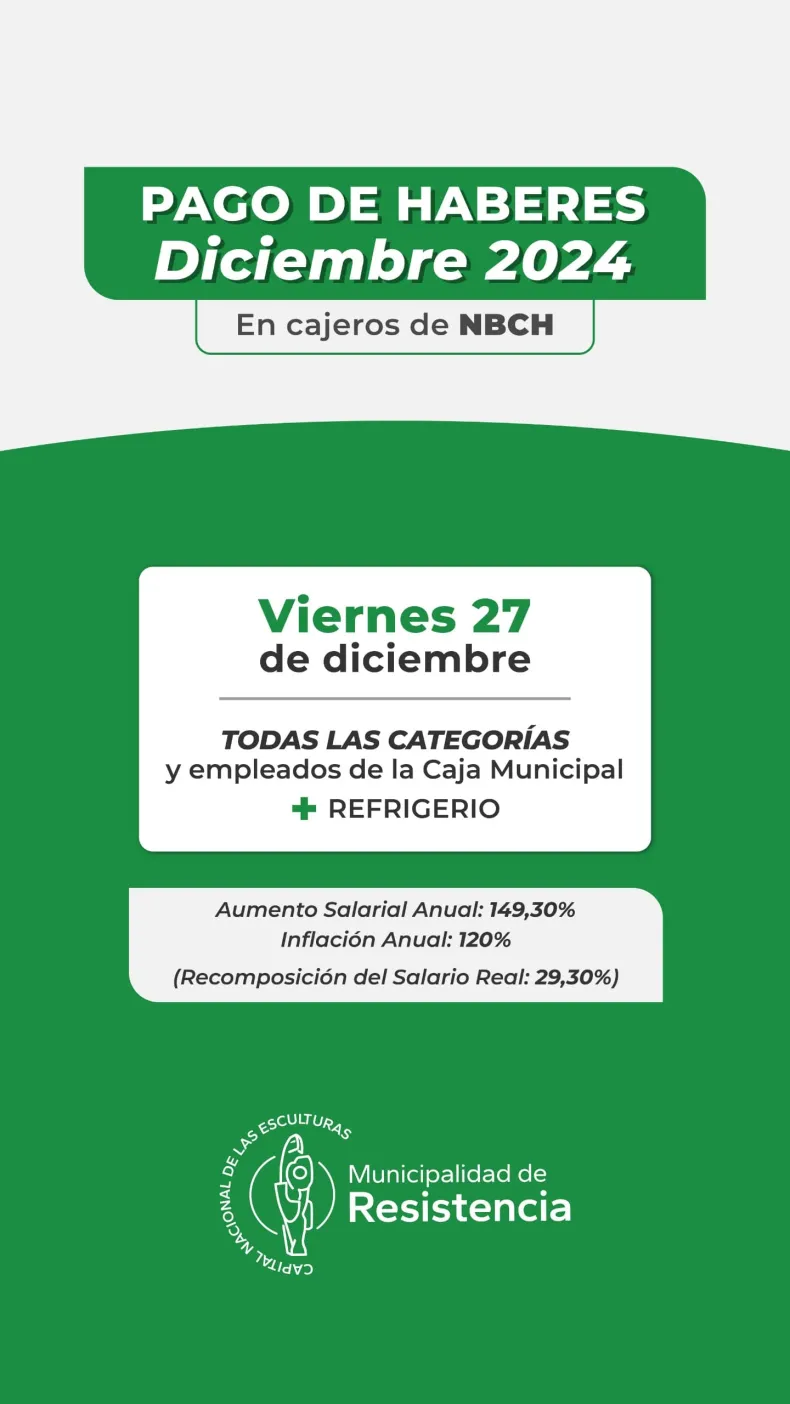 La Municipalidad de Resistencia pagará este viernes 27 de diciembre, los sueldos correspondientes al último mes del año, para el personal de todas las categorías y de la Caja Municipal.