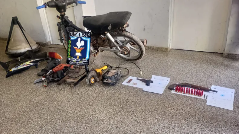 De los seis allanamientos realizados, se secuestraron los siguientes elementos: un arma de fuego (escopeta corta) calibre 28, 21 cartuchos marca ORBEA del mismo calibre y una vaina servida de la misma marca y calibre, dos cartuchos calibre 38, un faro presumiblemente del alumbrado público del "Parque del Encuentro" de esta ciudad, dos bochas de cocaína de 7 gramos, una motocicleta Honda Wave con numeración apócrifa, un arma de fuego calibre 22 marca Bersa con siete cartuchos sin percutir en su almacén cargador, una moladora Dewalt, un taladro Black & Decker, un tanque de combustible, un horquillón de moto, herramientas varias y motopartes.
