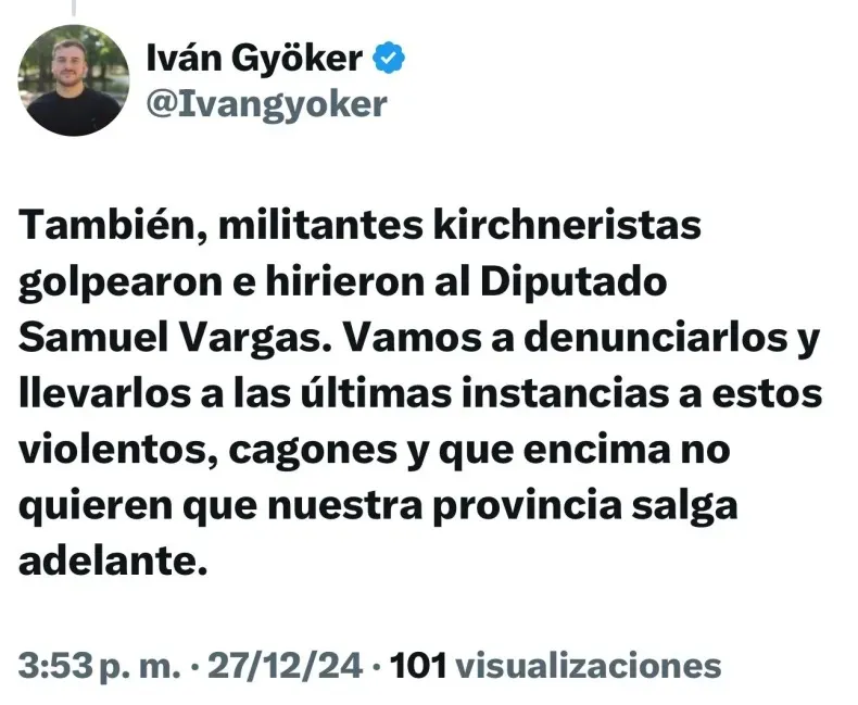 Sin embargo, antes de su detención, Larraburu presentó una denuncia ante la policía acusando a Vargas de ser el agresor. El militante, también conocido como "Piriki", se presentó acompañado por su abogada, Nahir Barud, y cuestionó la versión del diputado.
