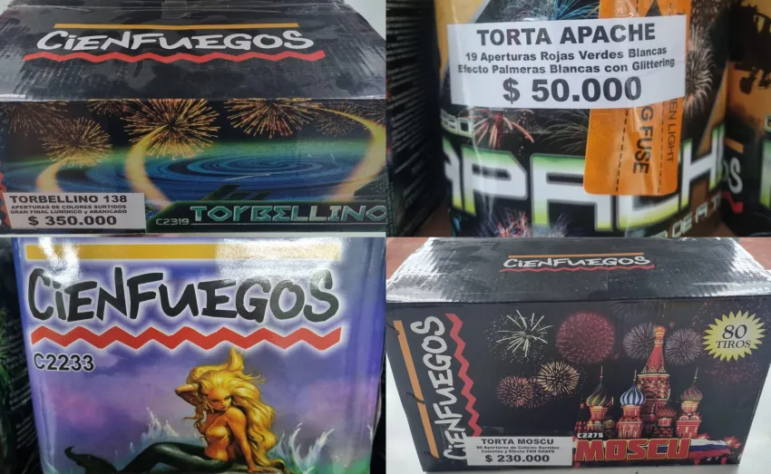 Algunos de los precios de venta libre son: 5 Bengalitas de Tres Colores $ 2.000, Globo Aerostático Grande Ignifugo $ 3.900, 200 Fosforitos $ 8.000, 12 Cañitas Silbadoras 35 Cm $ 4.000, 100 Estallos t/chaski boom $ 3.500