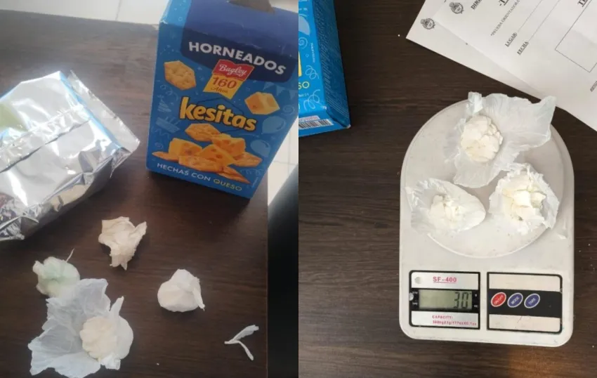 Los efectivos, al verificarlos, hallaron dentro de una caja de galletitas marca "Kesitas" tres envoltorios con una sustancia blanca.