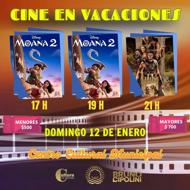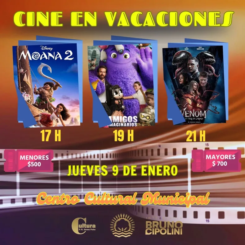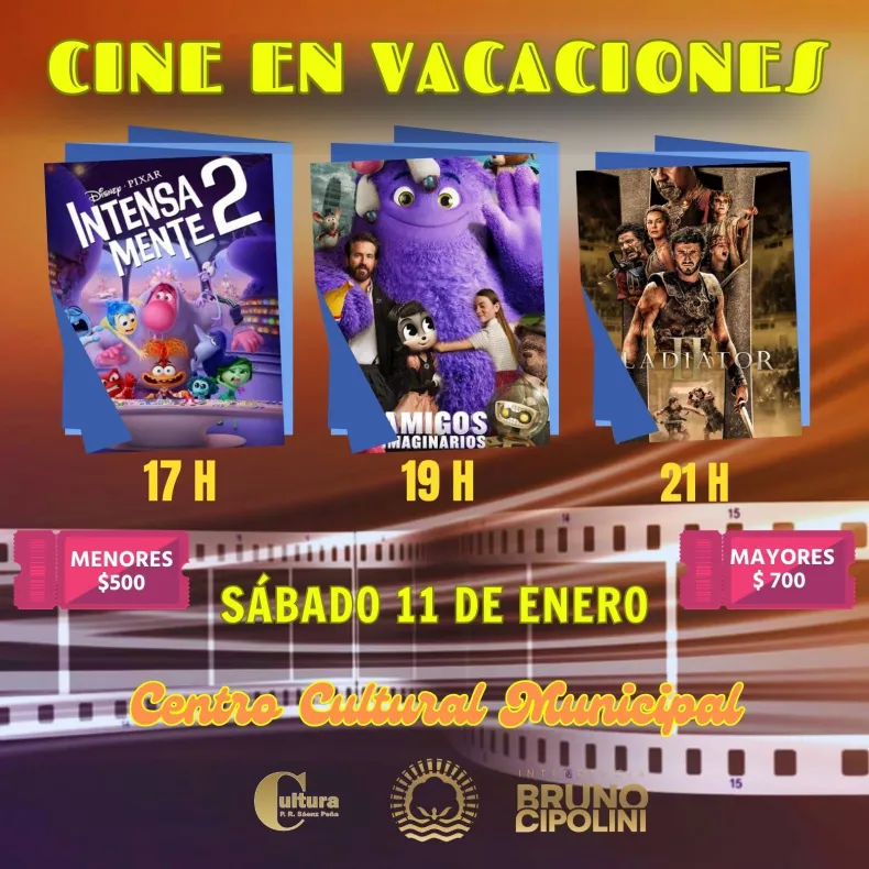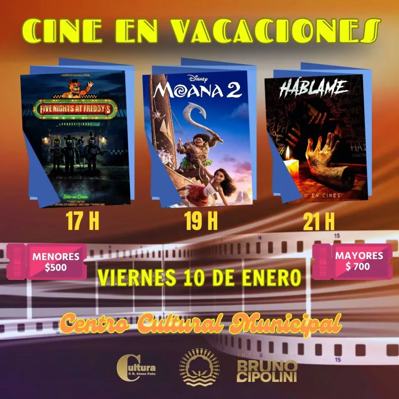 Con funciones a las 17, 19 y 21 horas, desde hoy se inicia el ciclo de Cine en Vacaciones, en el cine del Centro Cultural Municipal. Las entradas se pueden adquirir en la boletería del lugar a $ 500 para menores y $ 700 para mayores.