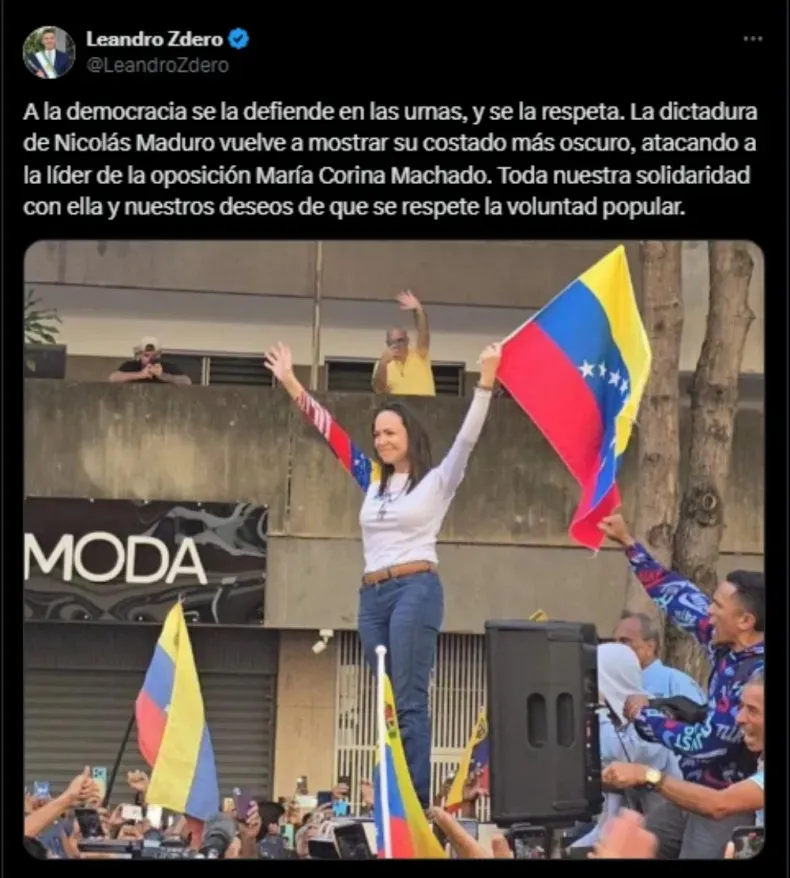 El gobernador de Chaco, Leandro Zdero, manifestó su rechazo y su apoyo a la líder opositora venezolana María Corina Machado, quien fue secuestrada por agentes del régimen de Nicolás Maduro.