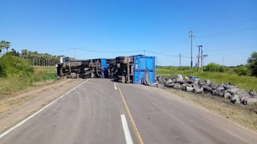 En el lugar, los efectivos se encontraron con un camión con acoplado volcado sobre la ruta. El camión, marca Sacaría, con chasis y acoplado, transportaba bolsas de carbón de 20 kg cada una, con una carga aproximada de 5.000 kilos.
