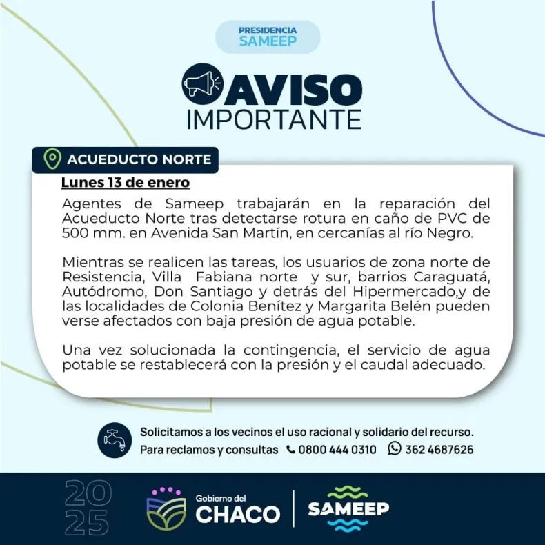 En ese sentido, indicaron que, mientras se realicen tareas, los usuarios de zona norte de Resistencia, Villa Fabiana norte y sur, barrios Caraguatá, Autódromo, Don Santiago y detrás del Hipermercado, y de las localidades de Colonia Benítez y Margarita Belén pueden verse afectados con baja presión de agua potable.