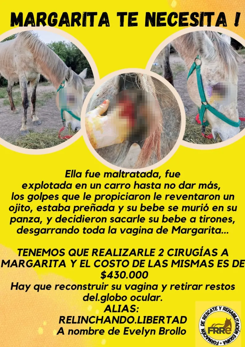 La yegua era sometida a tracción a sangre, sus dueños fueron denunciados, pero según informaron desde la fundación "siguen libres". Los miembros de Rescate y Rehabilitación Equina detallaron que a Margarita "le reventaron un ojo, y estando preñada ya casi a término de su gestación la seguían usando en el carro, lo que provocó que su bebé muera en la panza", fue así que quienes estaban a su cargo "decidieron quitarles ellos mismo a tirones su bebe muerto, lo que provocó que sufriera desgarro de ambos labios vaginales".