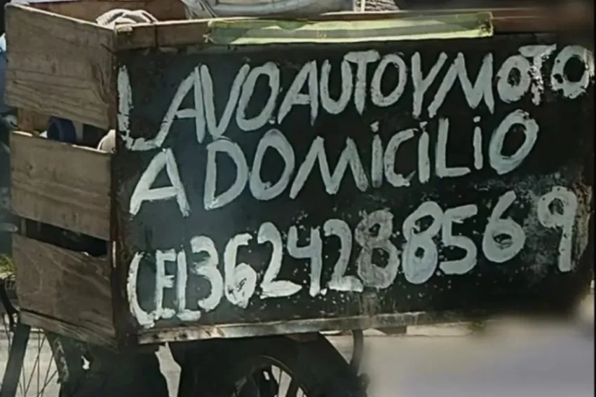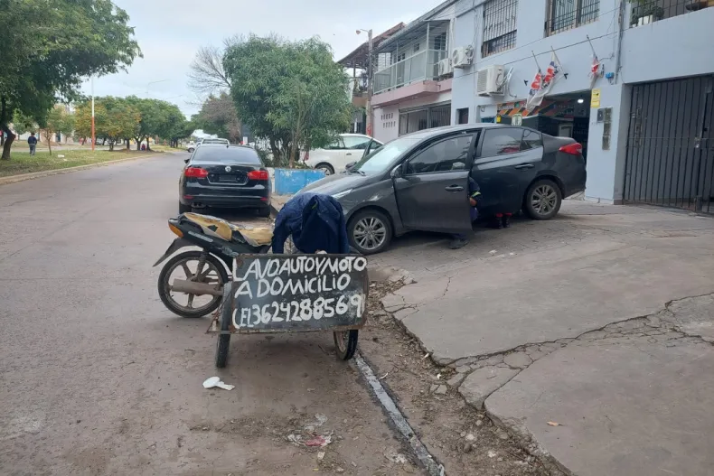 El hombre va en bicicleta por las calles de Resistencia, ofreciendo lavar autos a domicilio y su imagen se volvió se difundió en redes sociales para multiplicar su trabajo a través de la solidaridad de los usuarios.