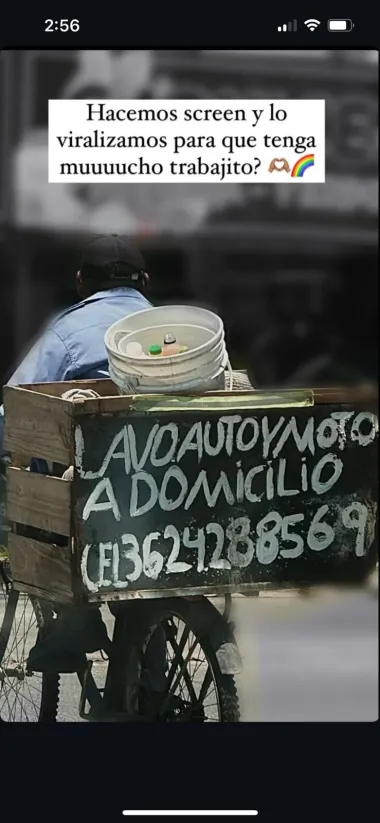 "Hacemos screen y lo viralizamos para que tenga mucho trabajito", fue el texto que acompañó la fotografía. Sus hijos tienen 28 años, uno 22 y una 18, quien es la única que aún vive con él en el barrio Zampa II y junto a ella y a su esposa, recorre las calles ofreciendo sus servicios de lavado de autos y motos a domicilio, que representa el principal sustento de su hogar.