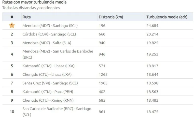 La ruta aérea más turbulenta del mundo se encuentra entre Mendoza y Santiago de Chile, con un trayecto de solo 196 kilómetros, pero que alcanzó una puntuación promedio de 24.684 puntos. La turbulencia en este vuelo es atribuida a los vientos de la Cordillera de los Andes y la altitud necesaria para atravesar este obstáculo natural. A esta ruta le sigue la de Córdoba a Santiago de Chile, con un recorrido de 660 kilómetros y una puntuación de 20.214, ocupando el segundo puesto en el ranking mundial.