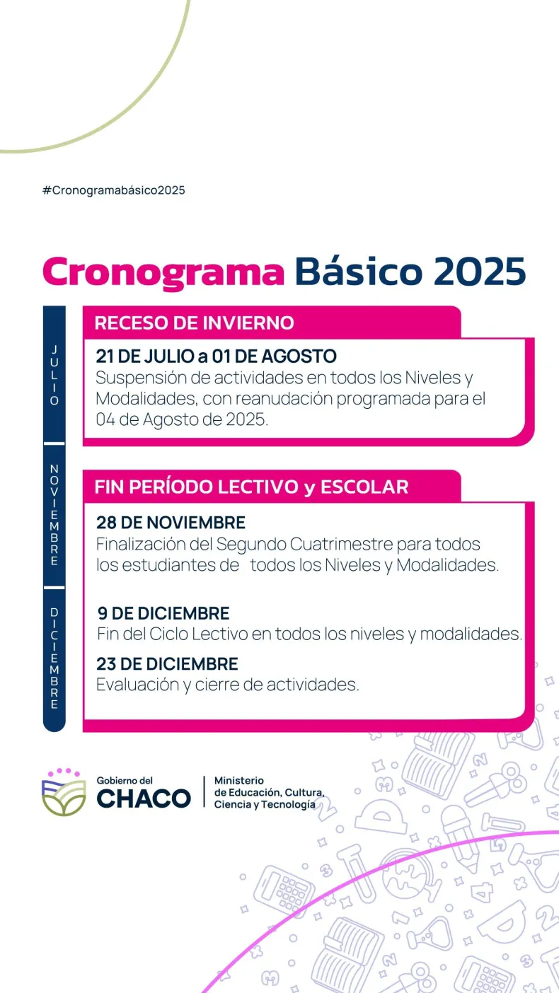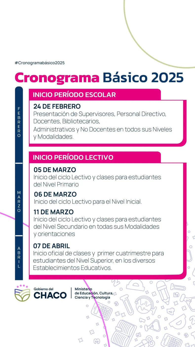El Ministerio de Educación, Cultura, Ciencia y Tecnología de la Provincia del Chaco dio a conocer el Calendario Básico Escolar 2025, que se estableció por medio de la Resolución Nº 4000/2025. El mismo determina que el período escolar comenzará el lunes 24 de febrero con la presentación de la primera obligación de los supervisores, personal directivo, docentes, bibliotecarios, administrativos y no docentes en las instituciones de todos los niveles y modalidades.