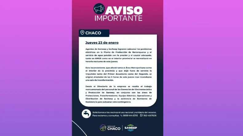 Desde el Directorio de la empresa se resalta el trabajo mancomunado del personal de las Gerencias de Electromecánica y Producción de Sameep, en conjunto con las áreas de Protecciones, Transformadores, Equipo Eléctricoctrico, Operaciones y Distribución de Secheep y la asistencia de Bomberos de Resistencia para subsanar esta contingencia.