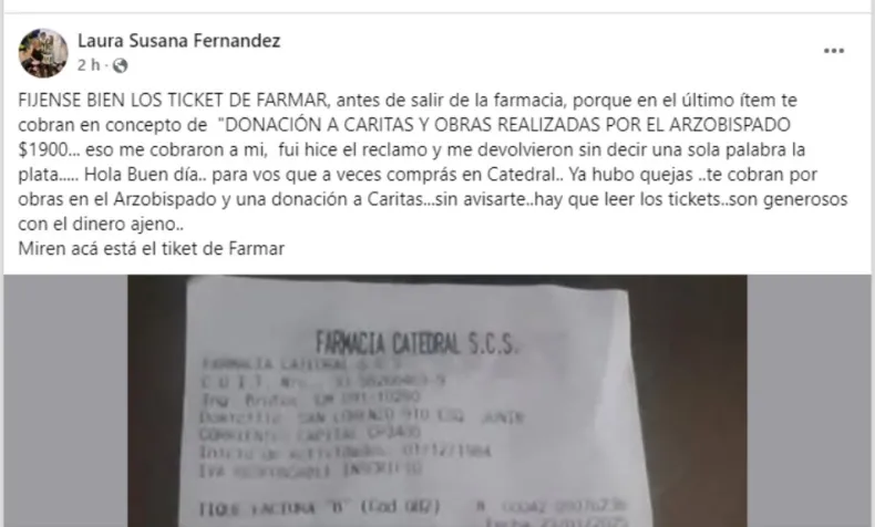 Una usuaria de Facebook denunció que en una sucursal de la reconocida cadena de farmacias Farmar le cobraron en el ticket un ítem en carácter de donación para Cáritas sin previa consulta.