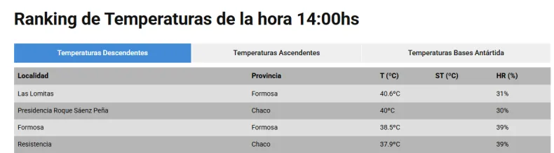 Sáenz Peña con 40 grados es en este momento la segunda ciudad más calurosa del país, mientras que Resistencia con 38° se ubica en el cuarto lugar, ambas antecedidas por localidades formoseñas.