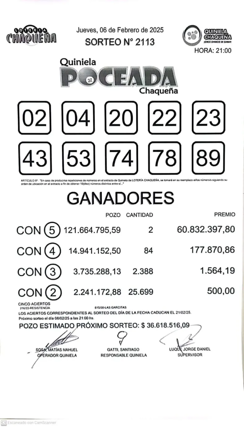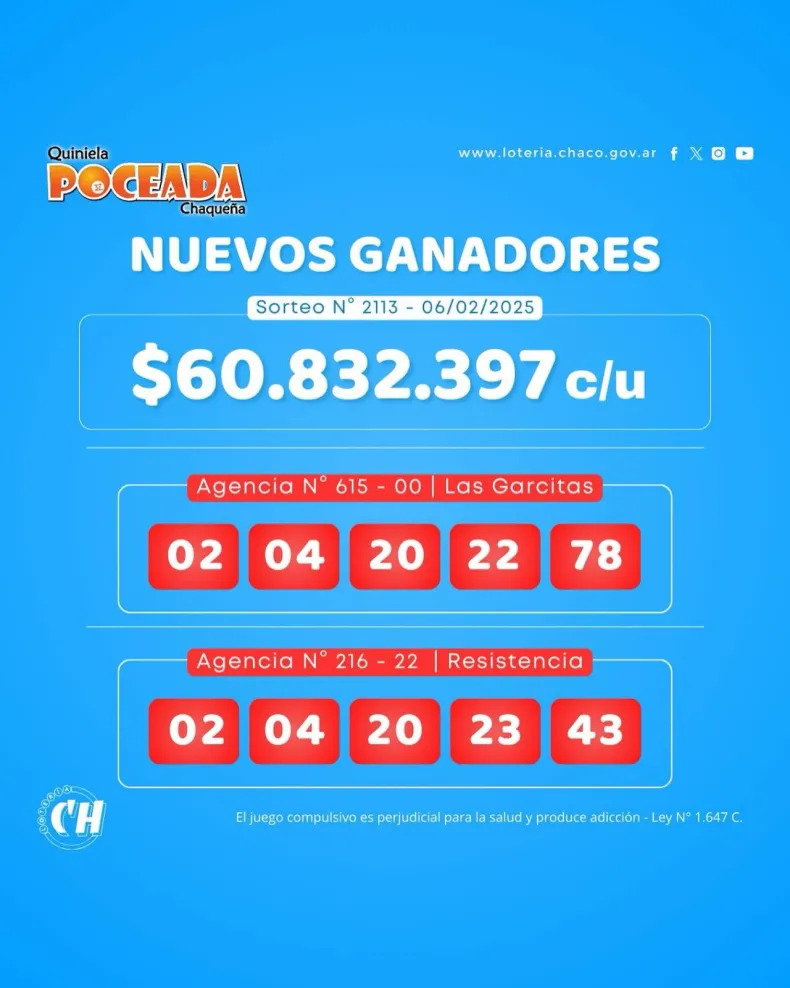 El sorteo N° 2113 de la Quiniela Poceada Chaqueña, realizado el jueves 6 de febrero de 2025, dejó dos grandes ganadores que acertaron los cinco números y se llevaron un premio de 60.832.397,80 pesos cada uno.