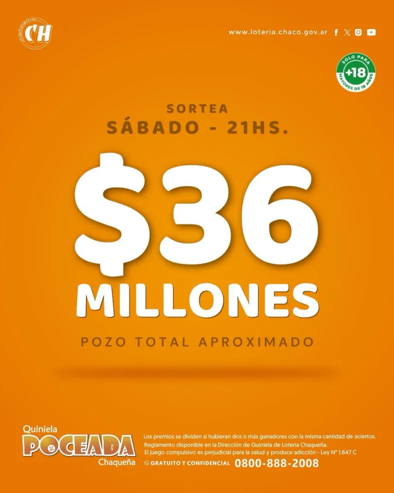 El próximo sorteo de la Poceada Chaqueña se realizará este sábado 8 de febrero de 2025 a las 21:00, con un pozo estimado de 36.618.516,09 pesos.
