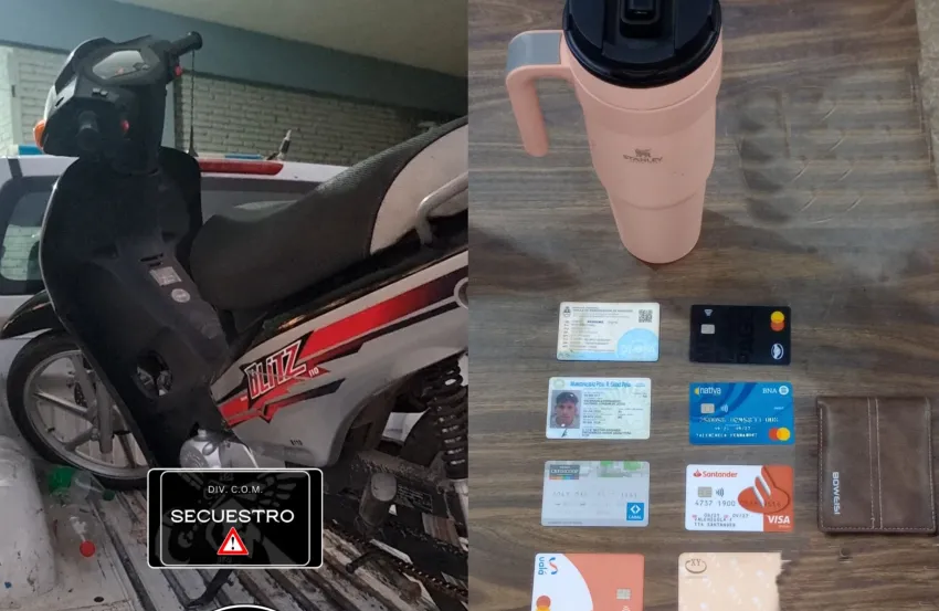 En el baúl de la moto se encontraron documentos de la damnificada y otros elementos. El menor quedó a disposición de la justicia de menores, mientras que el vehículo fue recuperado y devuelto a su propietaria.