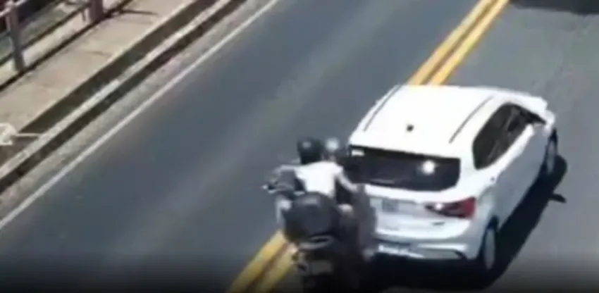 Según lo registrado por las cámaras SISE, el auto estaba detenido en un momento de atascamiento en el tránsito y la motocicleta impactó de lleno en la parte trasera del vehículo.