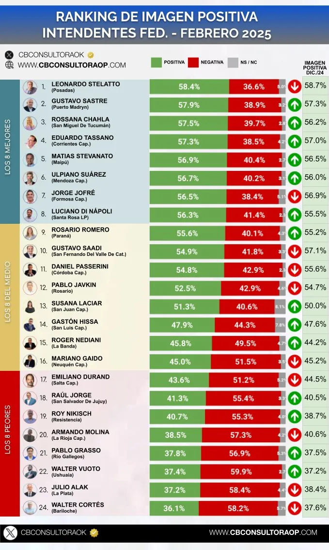 El ranking es liderado por Osvaldo Jaldo, de Tucumán, quien alcanzó una imagen positiva del 62,4%, seguido de Ignacio Torres (61,7%) y Maximiliano Pullaro (60,3%).