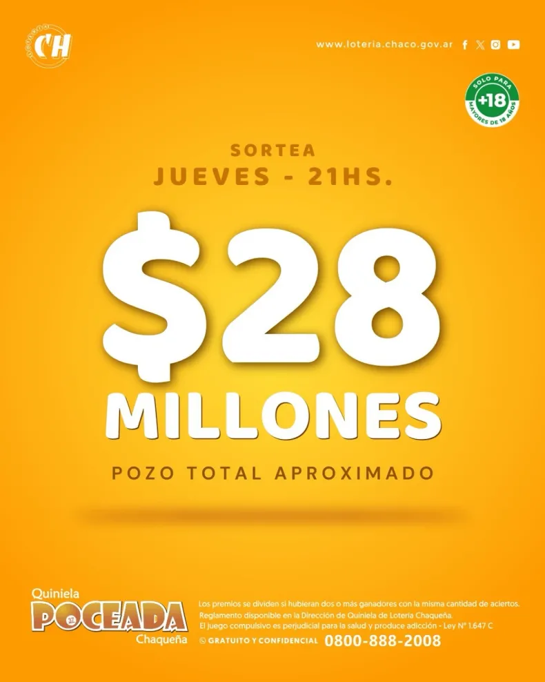 El próximo sorteo de la Poceada Chaqueña será el jueves 13 de febrero a las 21 horas, con un pozo acumulado de más de 28 millones de pesos.