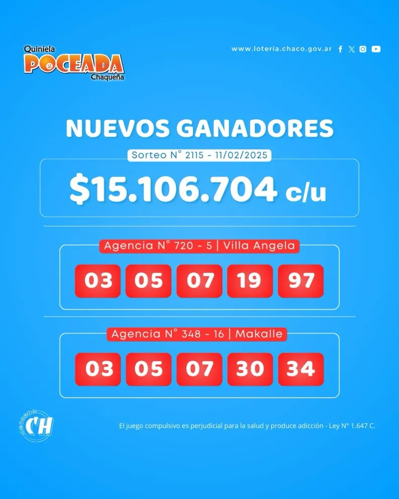 El sorteo de la Quiniela Poceada Chaqueña de este martes dejó dos nuevos millonarios en la provincia. Los afortunados ganadores son de Villa Ángela y Makallé, quienes acertaron los cinco números y se llevaron más de 15 millones de pesos cada uno.