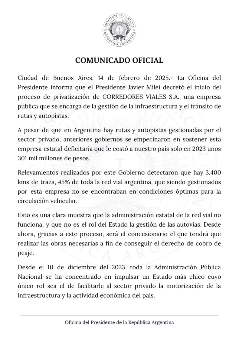 El Gobierno nacional anunció el inicio del proceso de privatización de la empresa estatal Corredores Viales S.A., encargada de la gestión de rutas y autopistas en Argentina. La medida fue oficializada mediante un comunicado emitido por la Oficina del Presidente.