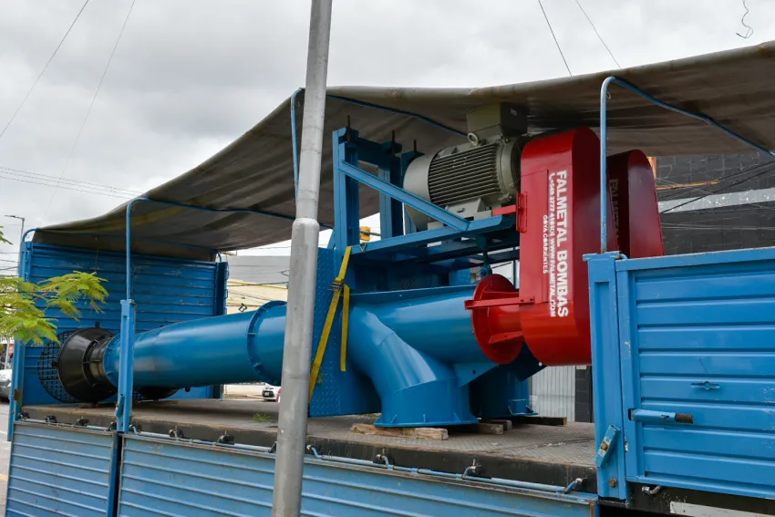 Este martes, el intendente Bruno Cipolini junto al secretario de Obras Públicas Claudio Gil, presentó dos bombas de un caudal de 4000 m3/h que potenciarán el sistema de desagües de la ciudad.