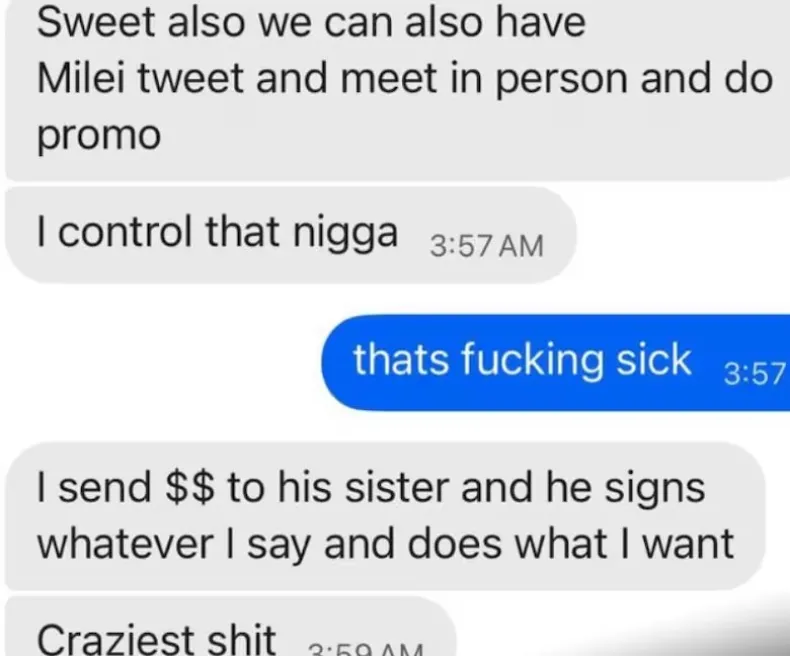La nota de CoinDesk revela supuestas frases muy fuertes de Hayden Davis. "Yo controlo a ese negro", aseguran que afirmó Davis en mensajes de texto de mediados de diciembre. Y habría agregado: "Le envío dinero a su hermana y él firma todo lo que digo y hace lo que quiero".