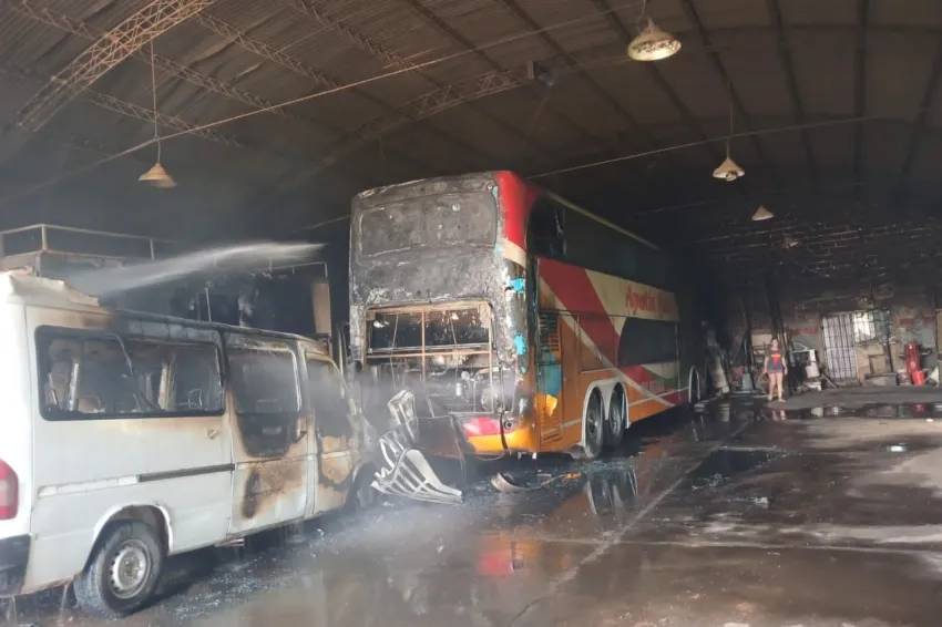 En el interior del galpón se encontraban varios vehículos, entre ellos un colectivo Mercedes Benz con carrocería Marcopolo identificado con la inscripción "Agustín Bus", una camioneta tipo trafic Mercedes Benz Sprinter y un camión Ford Cargo 914 térmico. Todos los rodados sufrieron daños parciales en su carrocería a causa del fuego.