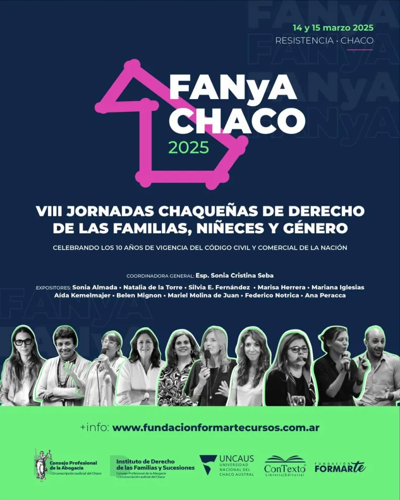 En los días 14 y 15 de marzo de 2025 se realizarán las VIII Jornadas Chaqueñas de Derecho de las Familias, Niñeces y Género en la ciudad de Resistencia, Chaco. Esta convocatoria federal, que inició sus actividades en el año 2016 y que tiene desde entonces un protagonismo en la agenda de capacitaciones nacionales, logra que en la ciudad de Presidencia Roque Sáenz Peña converjan prestigiosos docentes del país.
