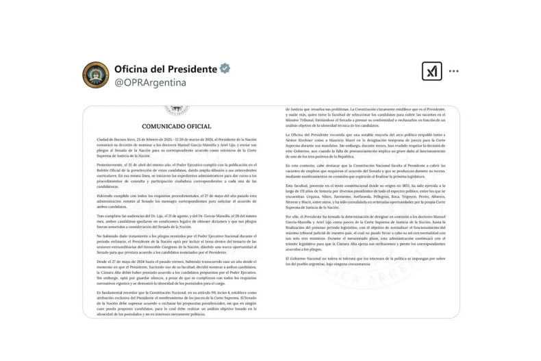 "El Presidente ha tomado la determinación de designar en comisión a los doctores Manuel García Mansilla y Ariel Lijo como jueces de la Corte Suprema de Justicia de la Nación, hasta la finalización del próximo período legislativo, con el objetivo de normalizar el funcionamiento del máximo tribunal judicial de nuestro país, el cual no puede llevar a cabo su ml con normalidad con tan solo tres ministros. Durante el mencionado plazo, esta administración continuará con el trámite legislativo para que la Cámara Alta ejerza sus atribuciones y preste los correspondientes acuerdos a los pliegos. El Gobierno Nacional no tolera ni tolerará que los intereses de la política se impongan por sobre los del pueblo argentino, bajo ninguna circunstancia".