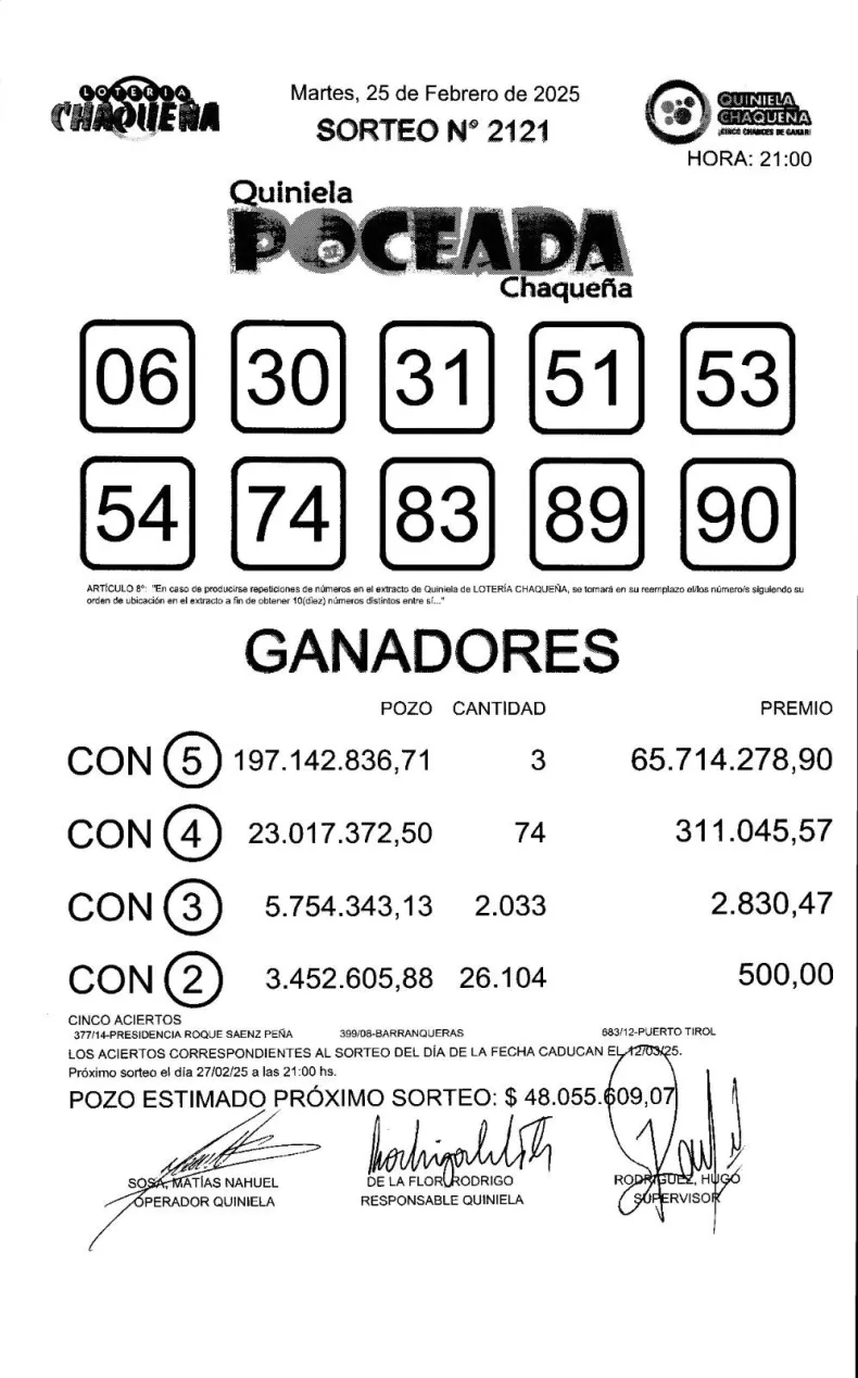 Luego de una serie de sorteos sin ganadores, tres apostadores lograron quedarse con un pozo de más de 197 millones de pesos. El sorteo tuvo lugar en la noche del martes. Los ganadores son de Sáenz Peña, Puerto Tirol y Barranqueras.