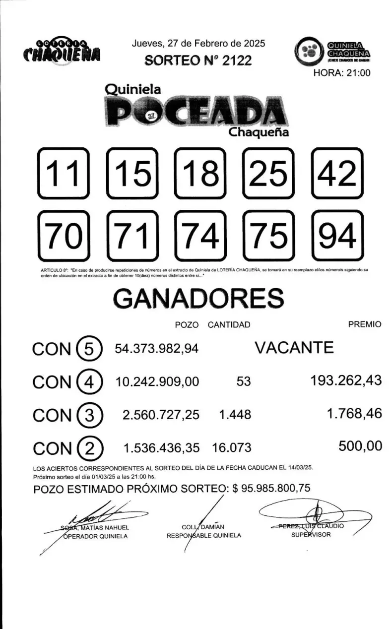 Luego del sorteo extraordinario del martes, donde tres afortunados se repartieron $ 200 millones, la Poceada Chaqueña del jueves 27 de febrero quedó vacante. Ningún apostador logró acertar los cinco números ganadores, por lo que el pozo acumulado se eleva a aproximadamente $ 100.000.000 para el próximo sorteo del sábado 1 de marzo.